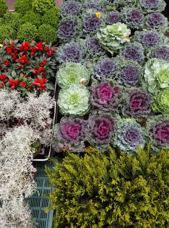 - cyklameny, wrzosy, kapustę ozdobną w różnej gamie barw i wielkości