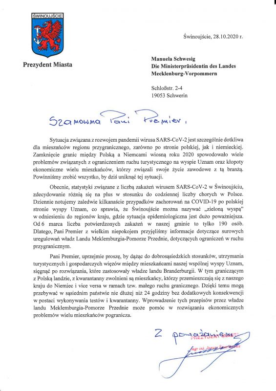 W związku z pandemicznymi obostrzeniami w Niemczech, które mają wpływ na życie mieszkańców Świnoujścia, prezydent Janusz Żmurkiewicz zaapelował do władz landu Meklemburgia Pomorze Przednie z prośbą o rozważenie złagodzenia niektórych rygorów.