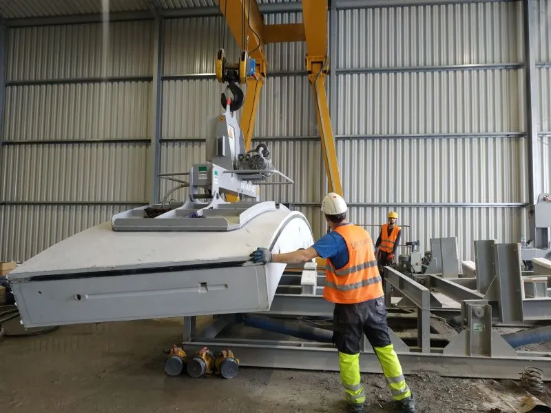 W zakładzie prefabrykacji trwa produkcja segmentów obudowy tunelu, które są następnie przewożone na plac magazynowy, a w odpowiednim czasie w rejon komory startowej.
