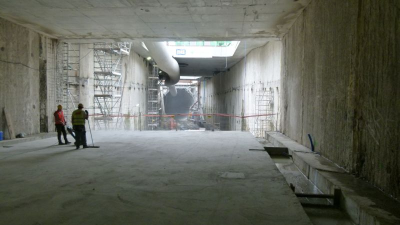 W rejonie rampy i tunelu wykonywanego metodą stropową prowadzone są prace konstrukcyjne. W ubiegłym tygodniu wyrównywano i uszczelniano ściany szczelinowe płyt dennych i stropowych oraz izolowano stropy.