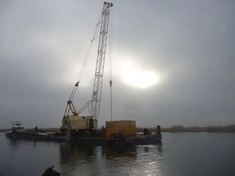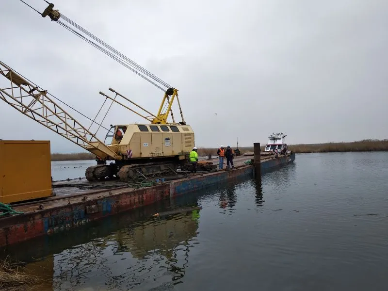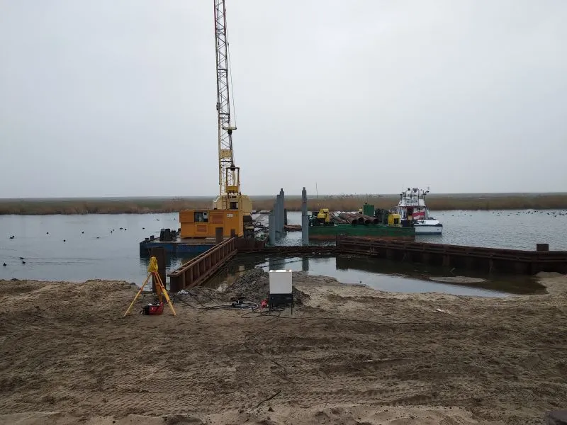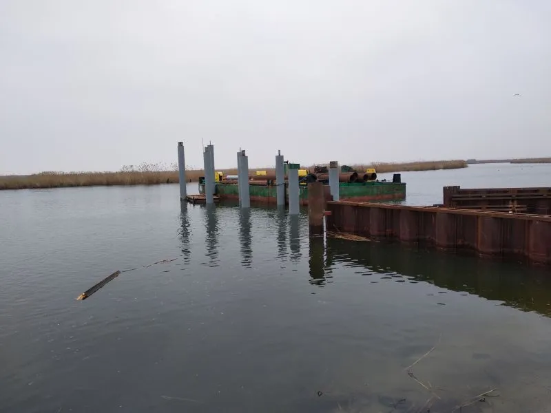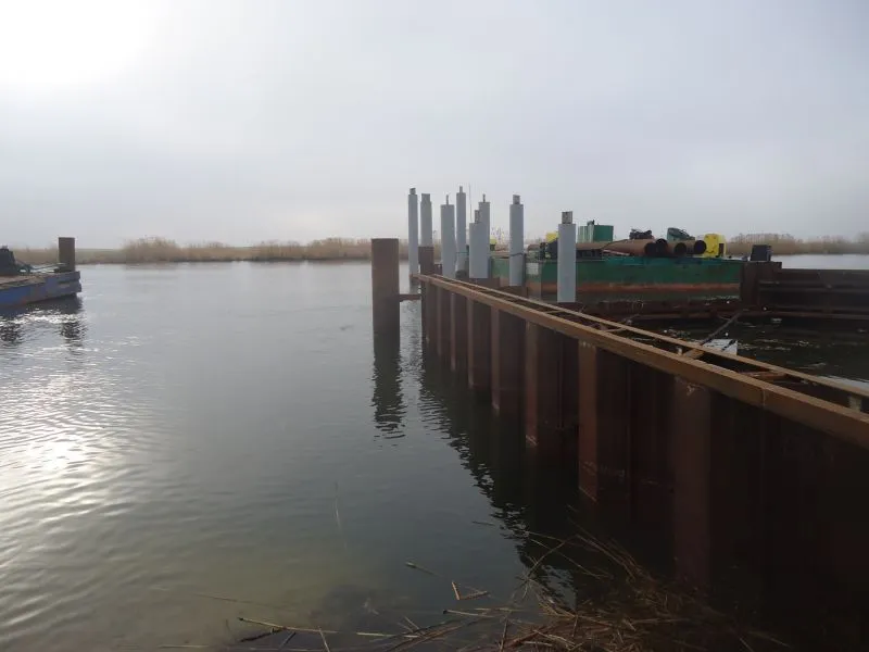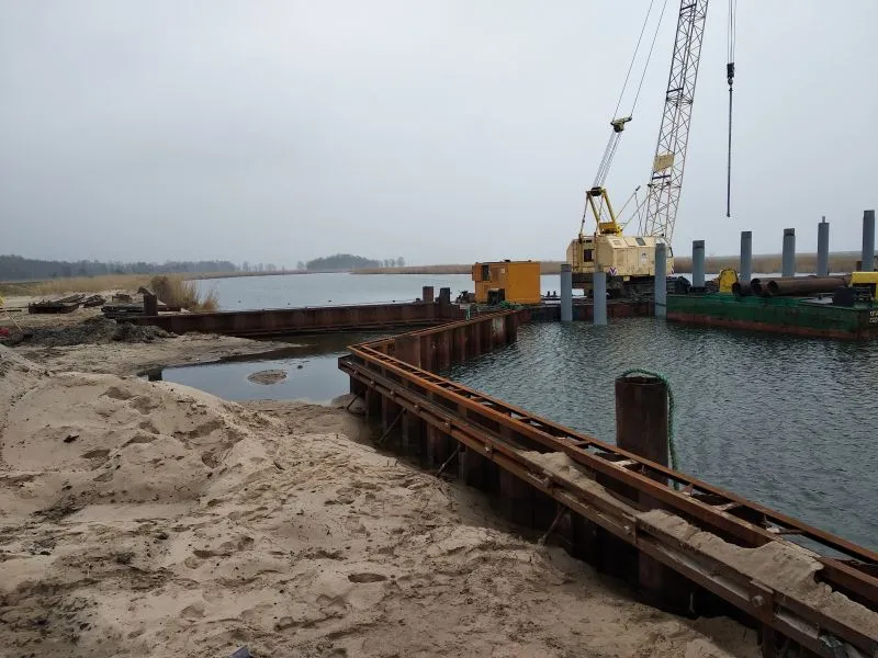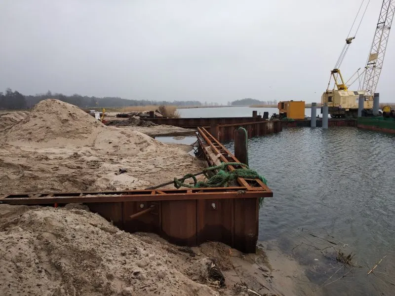 Wykonano też palowanie pod przyszłe pomosty pontonowe przy których będą cumowały łodzie. Poza terenem budowy jest prefabrykowana konstrukcja budynku głównego przystani, który na miejscu zostanie zmontowany.