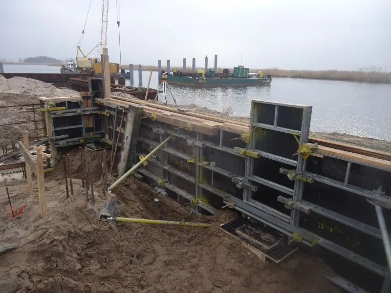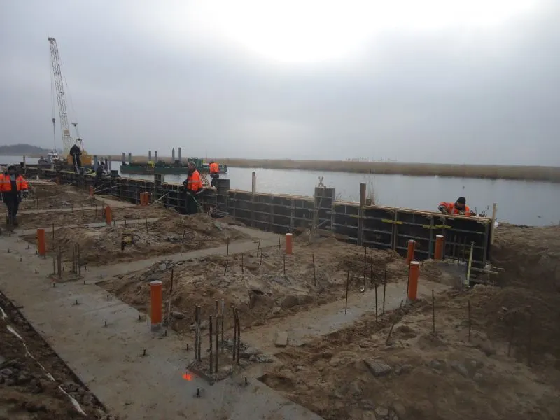 Na budowie codziennie coś się zmienia. Zrobione zostały ścianki szczelne wzdłuż brzegu Wielkiej Strugi. Wbite zostały pale na lądzie. Gotowe są też fundamenty pod budynek główny przystani. Dwa rzędy rur wychodzących w wodę wyznaczają linię pali wbitych pod slip, który będzie służył do transportowania łodzi na wodę.