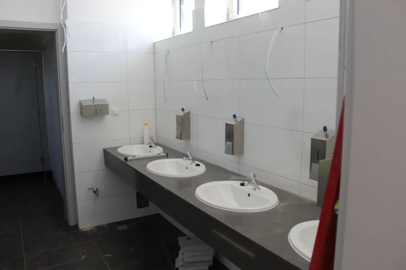 Wewnątrz zakończył się montaż armatury łazienek i toalet. Wyłożono płytki, kończy się montaż urządzeń elektrycznych i oświetlenia.