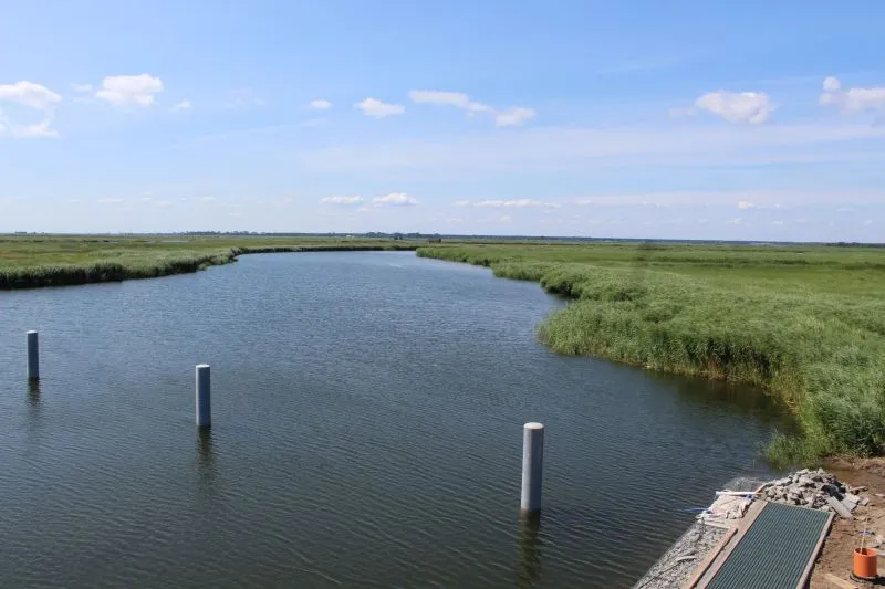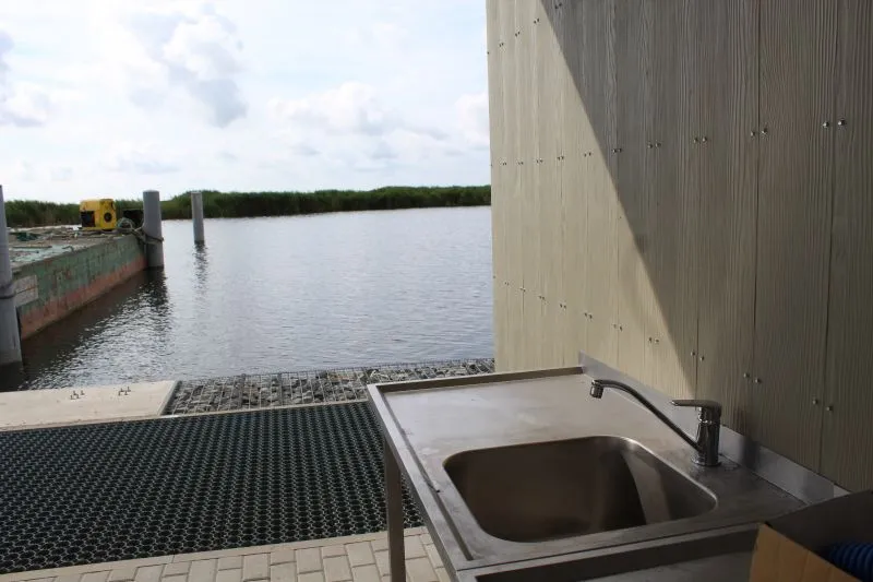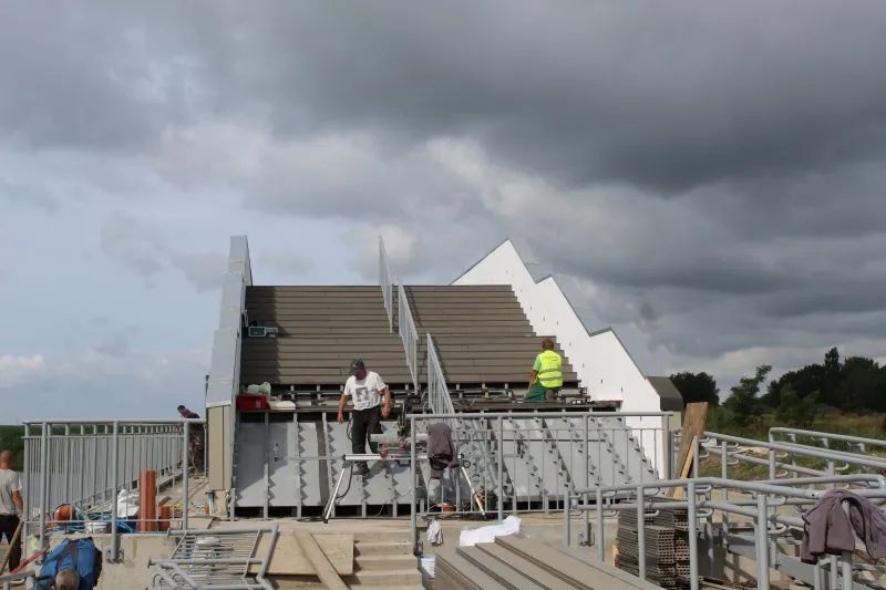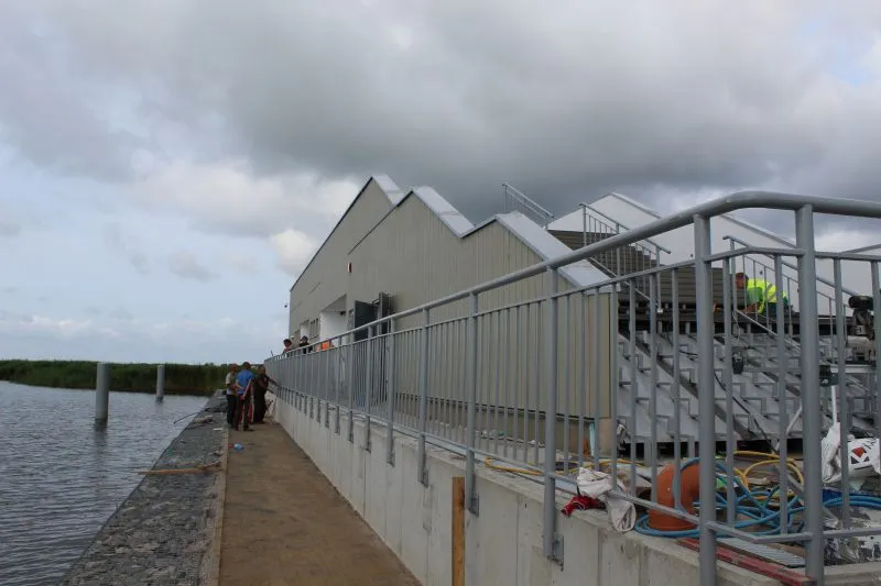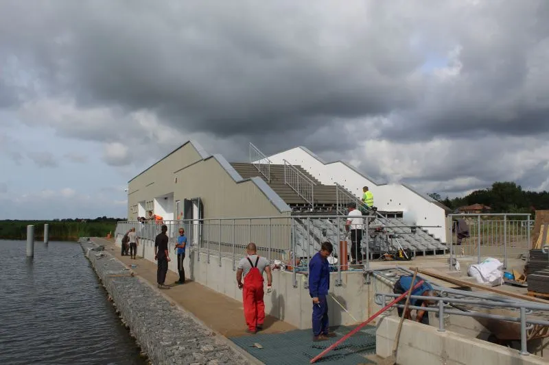 Niemal gotowy z zewnątrz jest główny budynek na przystani. Na jego szczycie już powstał taras, a obecnie kończony jest montaż schodów prowadzących na dach. Będzie można z niego podziwiać panoramę Wielkiej Strugi i pobliskich wysp.