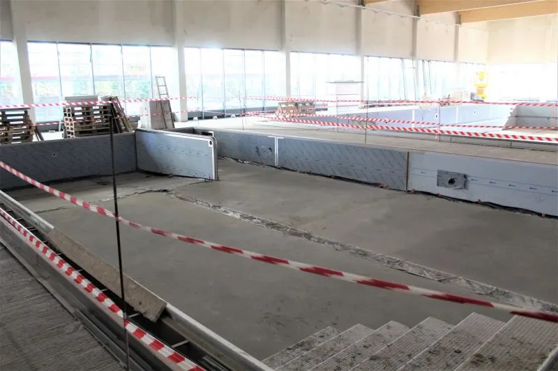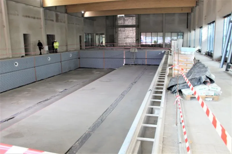 Wewnątrz są już wybudowane w stanie surowym niecki obu basenów. 25-metrowy będzie miał ruchome dno. Obok jest mniejszy basen rekreacyjny, do którego wchodzić się będzie schodkami.