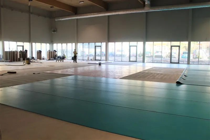 Operacja układania (wyklejania) wykładziny w hali sportowej odbywa się wręcz w sterylnych warunkach. Drzwi zewnętrzne są pozamykane, betonowa nawierzchnia dokładnie szlifowana i oczyszczana z pyłu. Dopiero na tak przygotowaną podłogę układana jest nawierzchnia boiska.