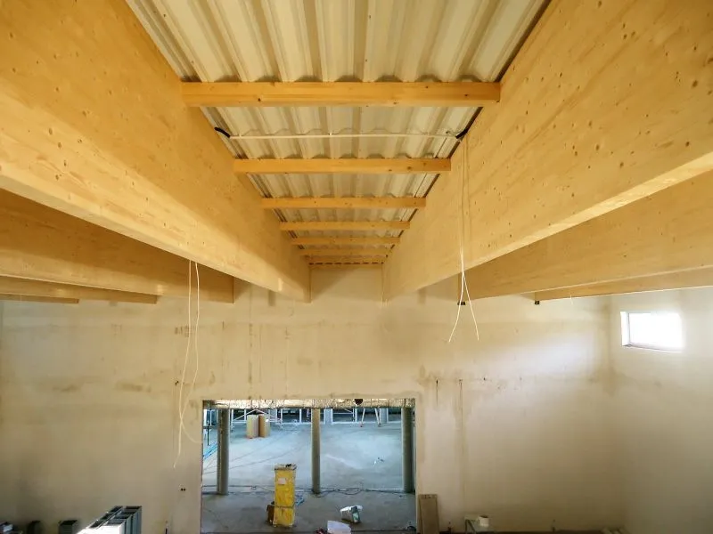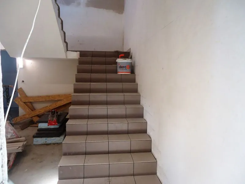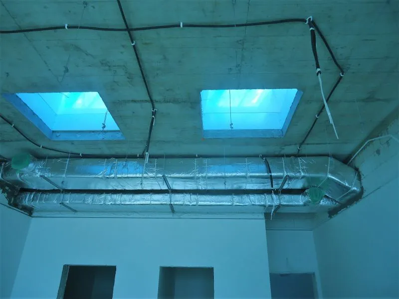 Są też już płytki na schodach wiodących do części administracyjnych przedszkola. Zamontowana jest stolarka drzwiowa i okienna zewnętrzna. Nie ma jeszcze wszystkich drzwi wewnątrz budynku. Na szczycie nad salą zabaw zamontowano duży świetlik, dzięki któremu teraz można prowadzić prace budowlane, a po oddaniu obiektu do użytku dzieci będą mogły się tu bawić bez potrzeby używania światła sztucznego.