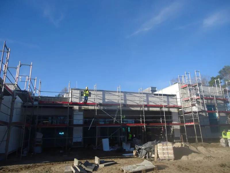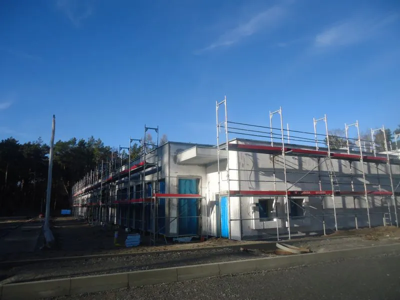 Więcej prac do wykonania pozostało na zewnątrz. Budynek jest ocieplony, a elewacja jest przygotowywana do malowania stąd cały jest obstawiony rusztowaniem.