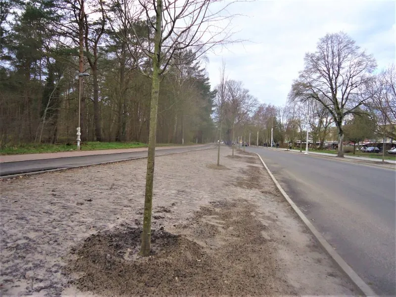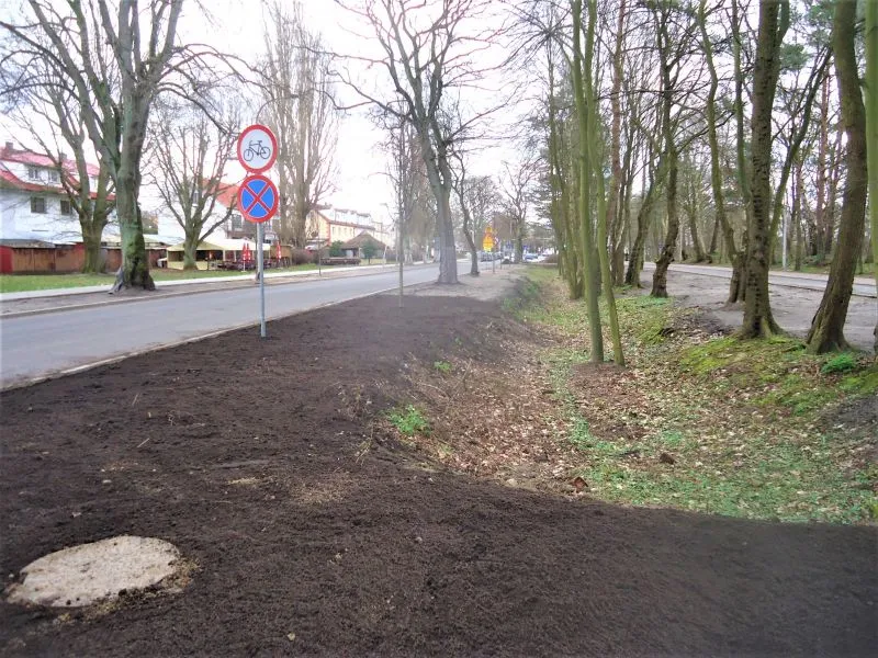 Właśnie zakończono nasadzenia prawie 80 nowych drzew. na obszarze oddzielającym jezdnię od ścieżki rowerowej i chodnika wysypywana jest warstwa czarnoziemu pod nowe nasadzenia.