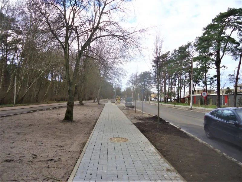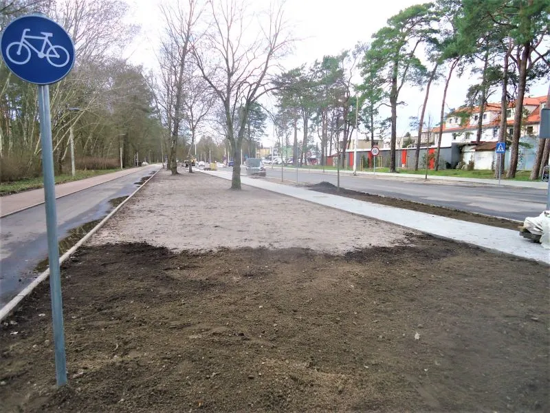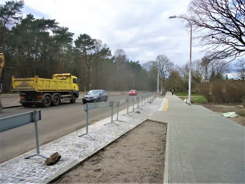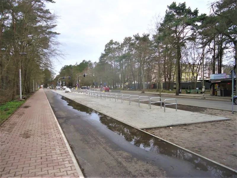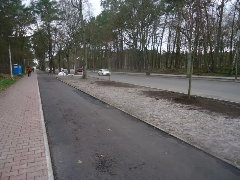 Powstała nowa ścieżka rowerowa (w sąsiedztwie dotychczasowej, z czerwonego polbruku, która teraz będzie ścieżką dla pieszych). Na ścieżce rowerowej brakuje jednak jeszcze ostatniej warstwy nawierzchni, dlatego po opadach tworzą się tutaj kałuże. Gdy zostanie ona wyłożona ostatnią warstwą, woda będzie spływała poza ścieżkę.