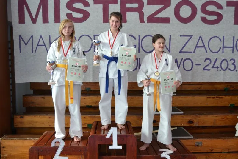 Magdalena Ilczuk, Kamila Wypych i Laura Giese ze Świnoujskiej Akademii Karate Kyokushin zdobyły złote medale na Mistrzostwach Makroregionu Zachodniego w Wejherowie. Dla Magdaleny Ilczuk były to wyjątkowe zawody. Złoty medale w kategorii kata seniorów zdobyła bowiem już po raz dziesiąty z rzędu. Doskonale spisała się także debiutująca w mistrzostwach tej rangi Laura Giese. Wygrywając w kategorii młodzików, udało jej się pokonać nie tylko rywalki, ale i własną tremę, która towarzyszyła jej przez wszystkie walki. Kamila Wypych okazała się z kolei najlepsza zawodniczką we kategorii kumite. Dobrze wypadł także inny świnoujski zawodnik Kamil Rusiecki, który zajął czwarte miejsce w kategorii kata. - Jednocześnie miło nam poinformować, że aż siedmiu zawodników Świnoujskiej Akademii Karate Kyokushin zostało powołanych do Kadry Polski na Mistrzostwa Europy w Hiszpanii, które odbędą się już w maju – dodaje Paweł Sujka, trener ŚAKK.To Jacek Antczak, Magdalena Ilczuk, Marcel Prelipcean, Patryk Golczak, Laura Giese, Kamil Rusiecki i Bartosz Jurczyk.
