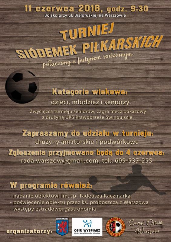 W najbliższą sobotę 11. czerwca 2016 r. odbędzie się uroczystość nadania imienia Tadeusza Kaczmarka nowemu boisku przy ulicy Białoruskiej. Oprócz części oficjalnej, w programie między innymi turniej piłkarskich siódemek, występy artystyczne, konkursy, i rodzinny festyn z małą gastronomią. Początek rozgrywek o godzinie 9.30. Natomiast rodzinny festyn i występy rozpoczną się od godziny 12.00. W imieniu organizatorów – Miasta Świnoujście i Zarządu Osiedla Warszów - serdecznie zapraszamy.