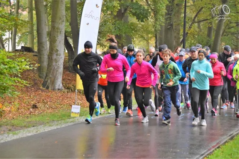 Sobotni (22.10.2016) deszczowy poranek nie zniechęcił biegaczy do porannego rozruchu. Pomimo niesprzyjającej aury na starcie stanęły 43 osoby, a bieg przygotowało 12 wolontariuszy. Do grona wolontariuszy dołączył siedmioletni Kacperek, który dzielnie kibicował biegaczom. Rozgrzewkę przed biegiem poprowadziła Ania.