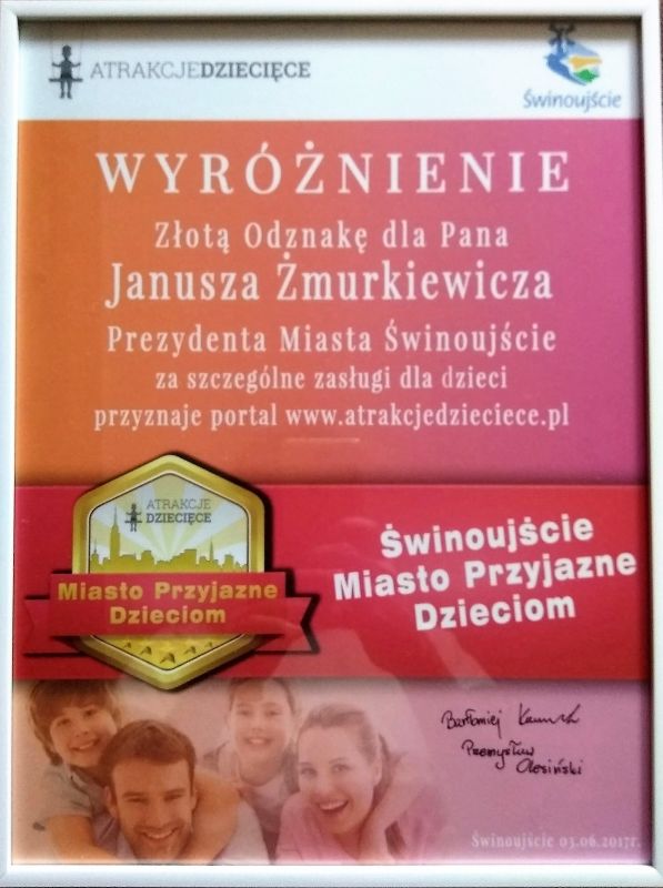 W sobotę 3 czerwca 2017 r., w trakcie imprez w muszli koncertowej z okazji Dnia Dziecka, prezydent Janusz Żmurkiewicz odbierze wyróżnienie – Złotą Odznakę Świnoujście Miastem Przyjaznym Dzieciom. Nagrodę przyznał portal www.atrakcjedzieciece.pl, który promuje miejscowości, w których istnieje wiele możliwości spędzenia wolnego czasu z dziećmi i zapewnienia im różnorodnych rozrywek.