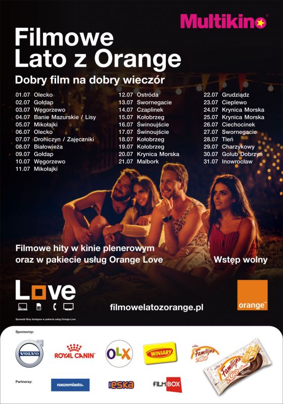 Rozrywka z Orange i Multikinem dotrze nad Bałtyk i w Karkonosze, na Mazury i Kaszuby, na Zamojszczyznę i na Podkarpacie.  W najpiękniejszych  zakątkach Polski niemal nieprzerwanie przez trzy miesiące trwać będzie prawdziwa kinowa przygoda. Świnoujście  i Cisna, Karpacz i Kołobrzeg, Białowieża i Białka Tatrzańska – to niektóre lokalizacje, do których zawita Filmowe Lato z Orange i Multikinem. W ciągu 84 dni odbędą się tam pokazy największych hitów festiwalowych, wakacyjnych evergreenów, tytułów wprawiających w doskonały nastrój.Już teraz zapraszamy kinomanów na bezpłatne pokazy w miastach, miasteczkach i popularnych kurortach wakacyjnych. Rozpoczynające się po zmierzchu projekcje kina plenerowego zostaną zaprezentowane w najlepszej jakości obrazu i dźwięku, którą gwarantuje Multikino, operator jednej z największych sieci multipleksów w Polsce.