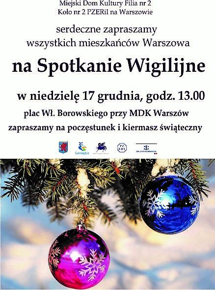 Spotkanie Świąteczne dla wszystkich mieszkańców z poczęstunkiem, kiermaszem i kolędami na placu Wł. Borowskiego przy MDK jest organizowane po raz pierwszy na Warszowie przez Koło nr 2 PZERiI i MDK. Ogromne wsparcie otrzymaliśmy od: Urząd Miasta Świnoujście, Zarząd Portu Szczecin-Świnoujście, Firma Marinus, Sklepy i Darczyńcy z Warszowa. Serdecznie zapraszamy.