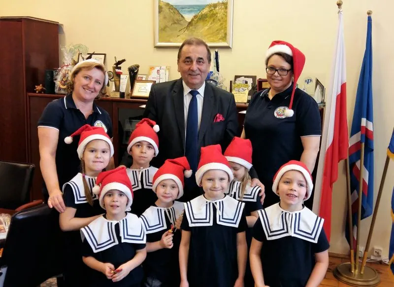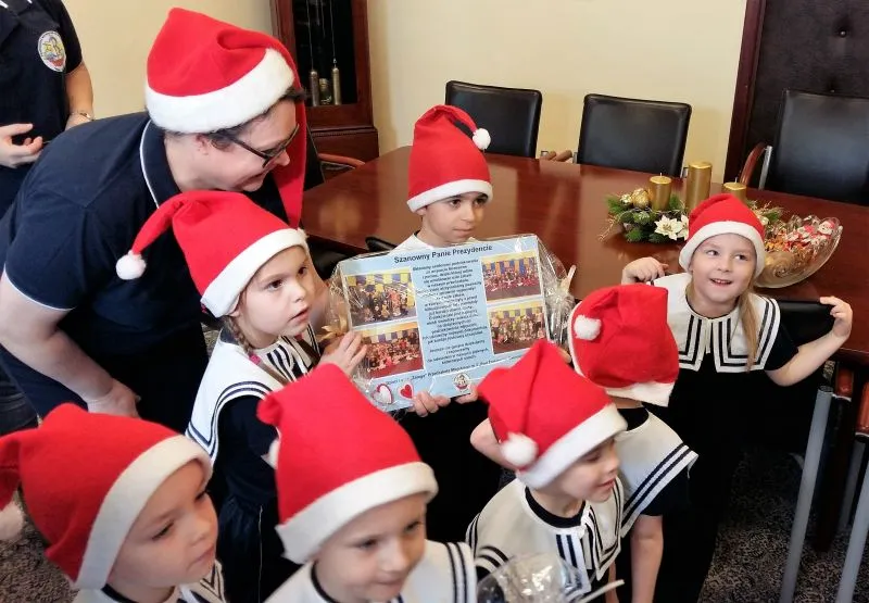 Wczoraj ze świątecznymi życzeniami odwiedziły prezydenta dzieci z przedszkola „Pod żaglami”. W prezencie przyniosły m.in. tablicę ze zdjęciami sal z nowym wyposażeniem.
