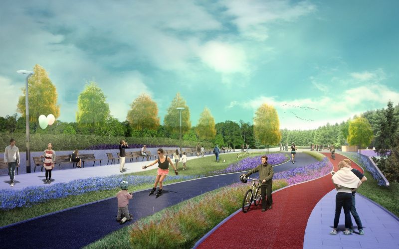 Wśród elementów wyposażenia pojawiają się również te przeznaczone do aktywnego spędzania czasu: niewielkie trampoliny ziemne, urządzenia rekreacyjne równoważnie i mini siłownie zewnętrzne, gra interaktywna, zamgławiacze oraz elementy wyposażenia skierowane do osób będących biernymi współuczestnikami aktywnego wypoczynku: tunele z wisterii, stoliki szachowe, fontanna, podest gastronomiczny. Nie zabraknie oczywiście zieleni i elementów małej architektury.