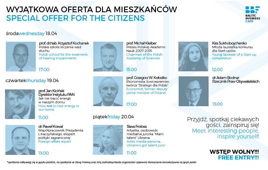 Profesor dr hab. Krzysztof Kochanek, dr Paweł Kowal, prof. Michał Kleiber, prof. Grzegorz Kołodko, dr Adam Bodnar - to tylko niektórzy z gości biorących udział w 10. Baltic Buisness Forum, które w dniach 18 - 20 kwietnia 2018 r. odbywać się będzie w hotelu Radisson Blu. Organizatorzy zapraszają mieszkańców i gości miasta na spotkania z uczestnikami. Zobacz kto i kiedy.