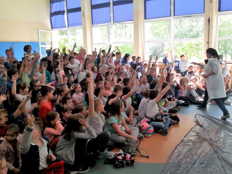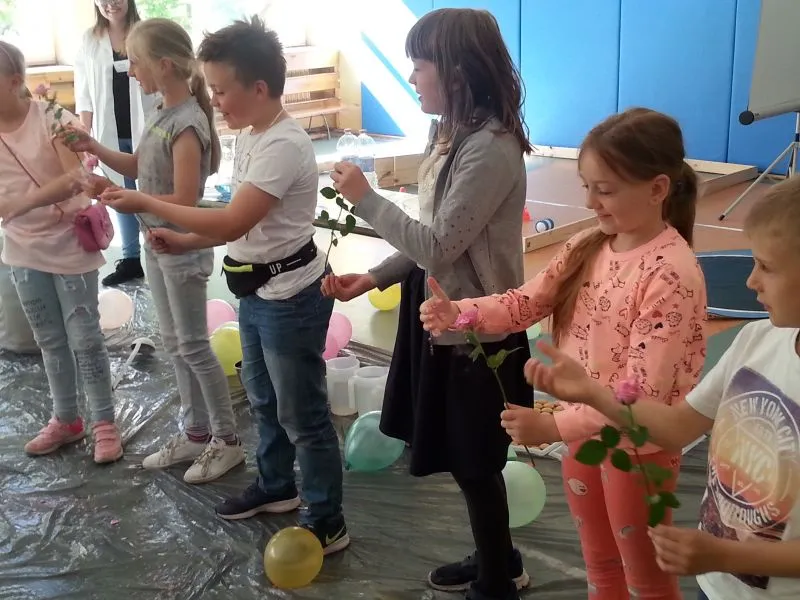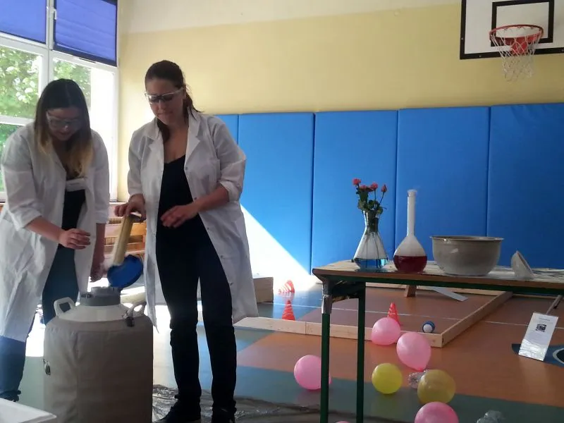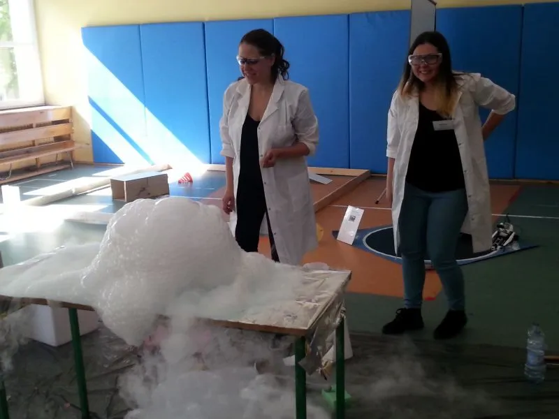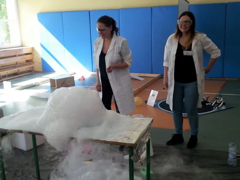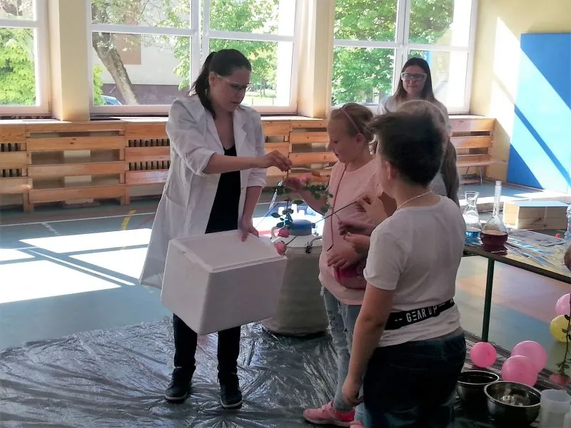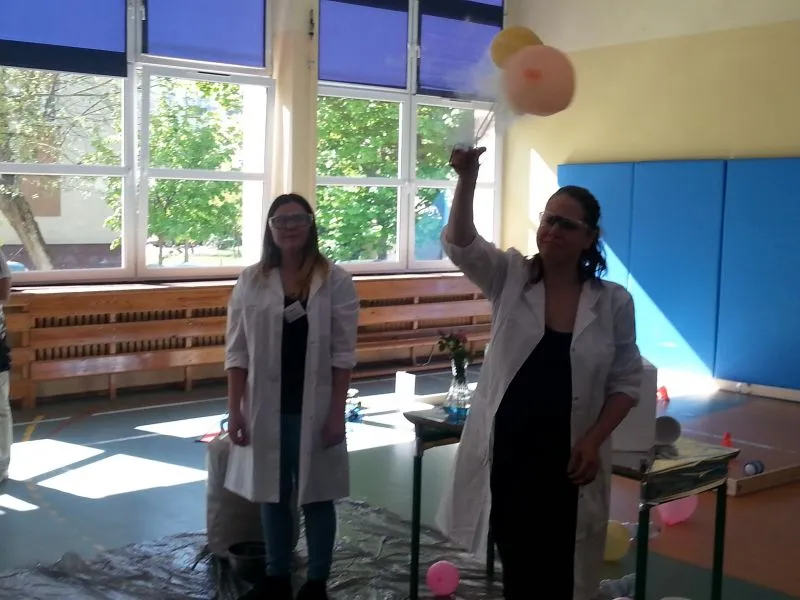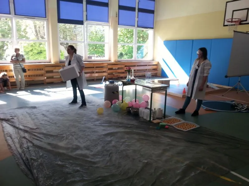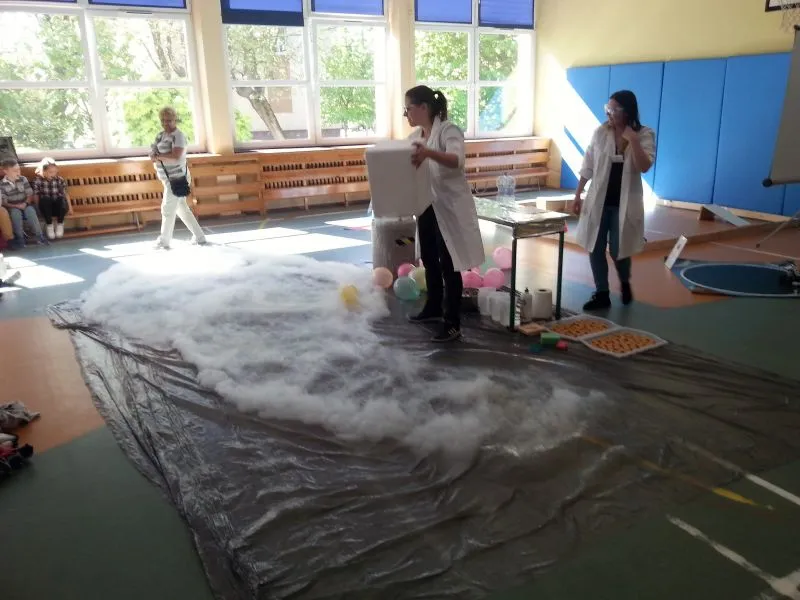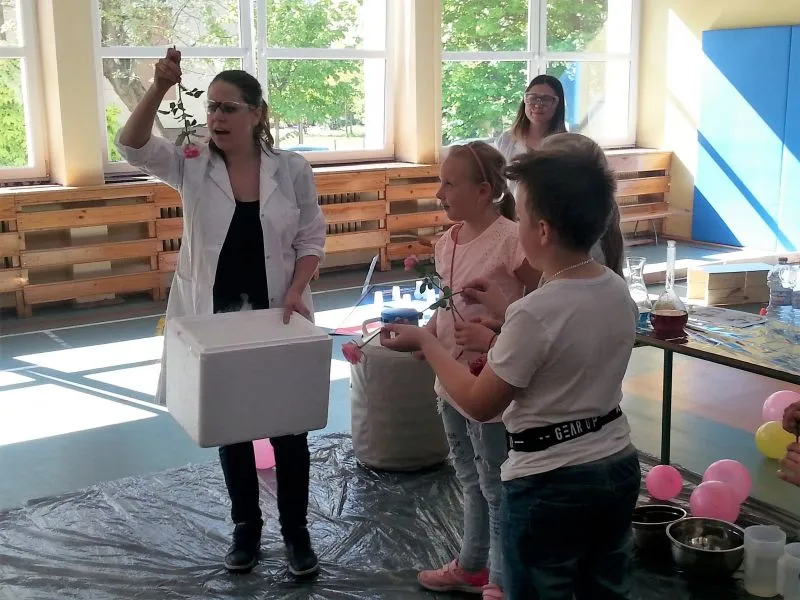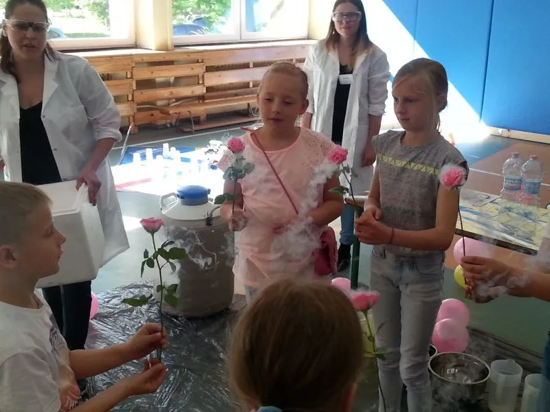Każdy dzień programowania rozpoczyna się pokazem naukowym, który bacznie obserwują  wszyscy uczniowie naszej szkoły. Dużym zainteresowaniem cieszyło się doświadczenie, do którego wykorzystano substancję o ekstremalnie niskiej temperaturze, bo aż  -200°C! Oprócz tego dzieci mogły zobaczyć ciekawe zabiegi badawcze z udziałem ciekłego azotu, a chwilę później  podziwiać wyniki tych doświadczeń, którymi było m.in. powietrze w formie cieczy, mgła Harry'ego Pottera, czy imponujące, kruche róże. Chętni uczniowie zgłaszali się do doświadczenia, w którym  mogli spróbować wbić gwóźdź bananem. To tylko zaledwie kilka