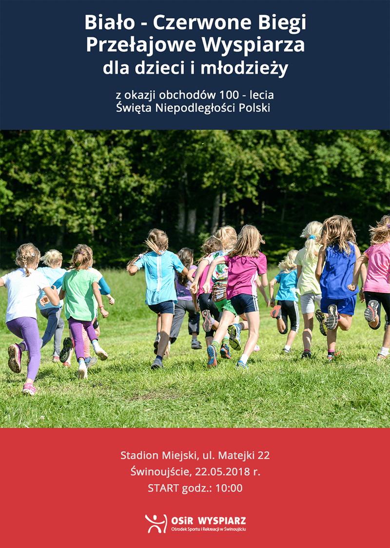 BIAŁO – CZERWONE BIEGI PRZEŁAJOWE WYSPIARZA Z OKAZJI 100 – LECIA ŚWIĘTA NIEPODLEGŁOŚCI POLSKI. Akces zgłosiło 700 młodych Polaków ze świnoujskich przedszkoli, szkół podstawowych oraz ponadgimnazjalnych. Dla najmłodszych zabawy odbędą się na płycie stadionu. Starsi rywalizować będą na przełajowej trasie biegowej, na koronie stadionu.