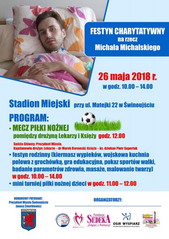 W imieniu Stowarzyszenia Drużyna Aniołów, Szpitala Miejskiego im. J. Garduły, Ośrodka Sportu i Rekreacji „Wyspiarz oraz pozostałych współorganizatorów, pragniemy zaprosić wszystkich ludzi o wrażliwych sercach w dniu 26 maja br. o godz. 10.00 na festyn charytatywny dedykowany Michałowi Michalskiemu. Impreza odbędzie się na Stadionie Miejskim OSiR przy ul. Matejki 22 (płyta z nawierzchnią trawiastą). W programie m.in. mecz lekarze kontra księża.