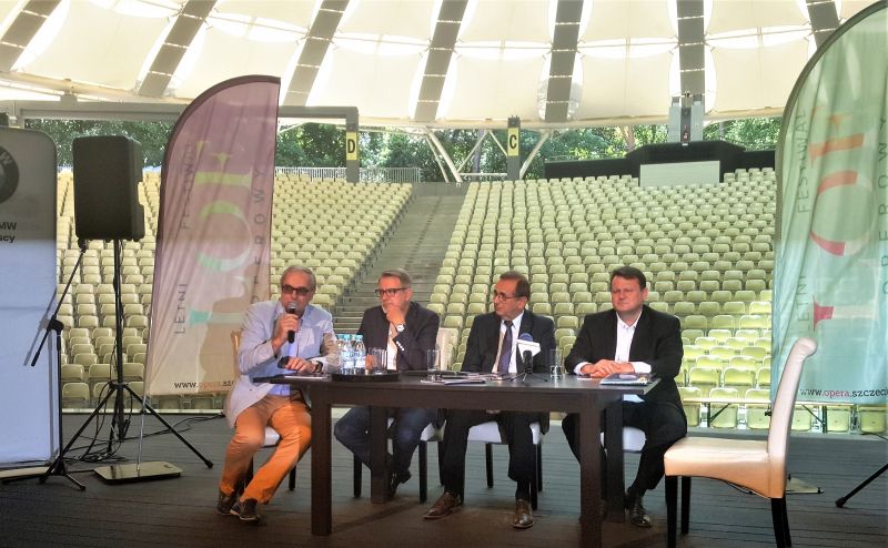 Na deskach sceny świnoujskiego Amfiteatru odbyła się wspólna konferencja prasowa Dyrektora szczecińskiej Opery na Zamku Jacka Jekiela i Prezydenta Świnoujścia Janusza Żmurkiewicza. W spotkaniu z dziennikarzami udział wzięli również Zastępca Prezydenta Paweł Sujka oraz Dyrektor MDK Ryszard Kowalski.