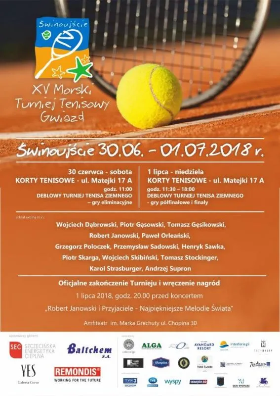 Piotr Gąsowski, Grzegorz Poloczek, Piotr Skarga, Henryk Sawka, Wojciech Dąbrowski, Tomasz Gęsikowski, Przemysław Sadowski, Wojciech Skibiński, Tomasz Stockinger, Karl Strasburger i Andrzej Supron – to uczestnicy XV Morskiego Turnieju Tenisowego Gwiazd. Turniej rusza w sobotę 30. czerwca o godzinie 11.00. W sobotę gry półfinałowe i finałowe od godzin 11.30 do 18.00. Wstęp wolny.