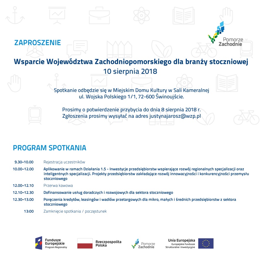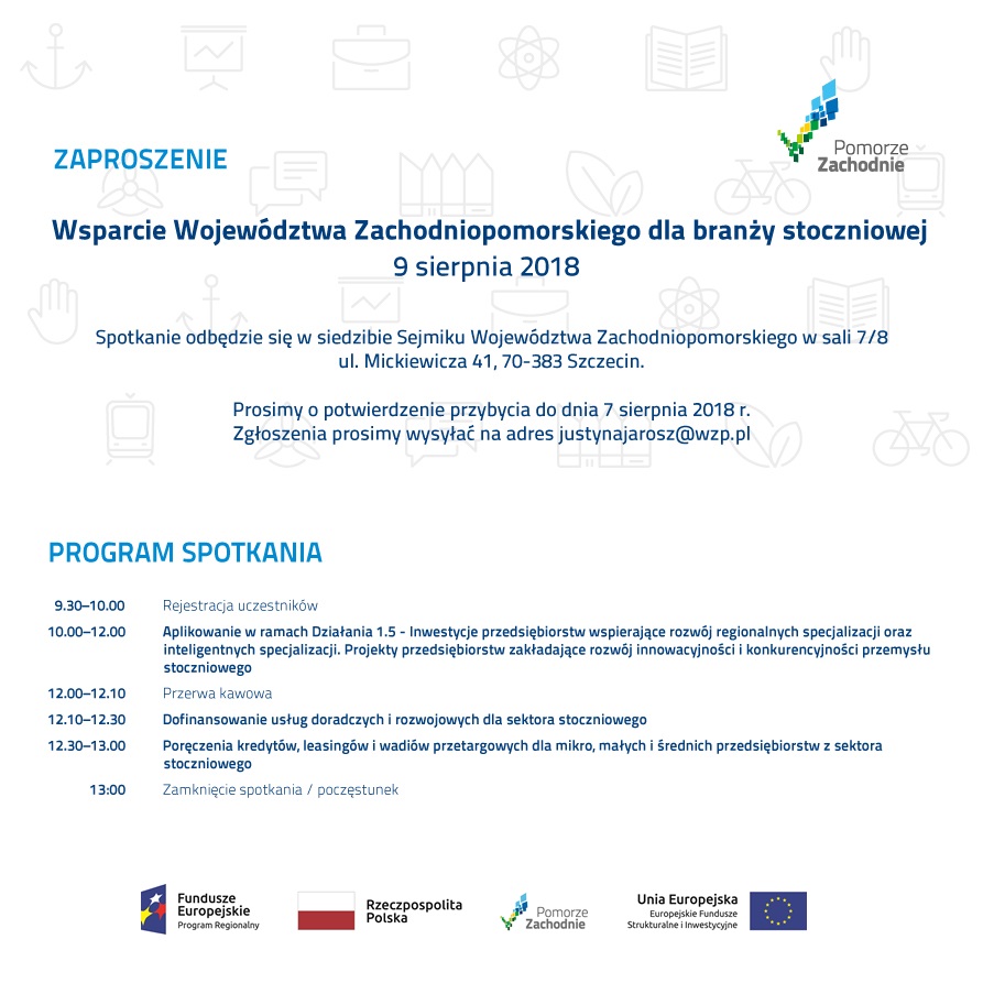 W najbliższy czwartek i piątek odbędą się spotkania informacyjne dotyczące pozyskiwania funduszy europejskich pt. „Wsparcie Województwa Zachodniopomorskiego dla branży stoczniowej”. Spotkania skierowane są także do średnich i małych firm z branży stoczniowej.