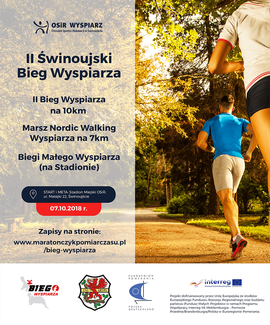 Ośrodek Sportu i Rekreacji "Wyspiarz" rozpoczyna zapisy do II Świnoujskiego BIEGU WYSPIARZA! START i META w dniu 7 października 2018 r. na Stadionie Miejskim przy ul. Matejki 22. Dzięki temu, że Projekt dofinansowany jest przez Unię Europejską ze środków Europejskiego Funduszu Rozwoju Regionalnego oraz budżetu państwa (Fundusz Małych Projektów w ramach Programu Współpracy Interreg VA Meklemburgia – Pomorze Przednie/Brandenburgia/Polska w Euroregionie Pomerania, uczestników nagrodzimy wieloma pamiątkami. Współorganizatorem projektu jest HSG UNI Greisfwald e.V. Partnerem - 8 FOW.