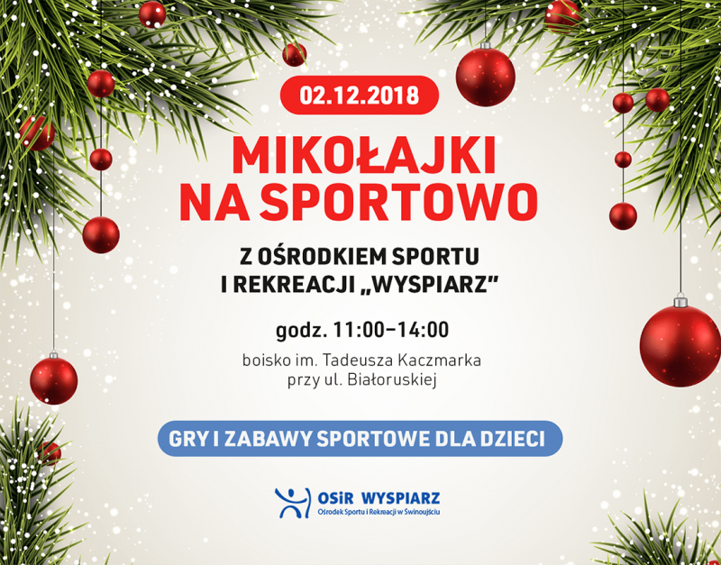 Ośrodek Sportu i Rekreacji „Wyspiarz” serdecznie zaprasza wszystkie dzieci do wzięcia udziału w MIKOŁAJKACH NA SPORTOWO, które odbędą się w dniu 2 grudnia br w godzinach od 11:00 do 14:00 na boisku im. Tadeusza Kaczmarka przy ul. Białoruskiej 2. W programie Mini Turniej Piłki Nożnej (drużyny 5 osobowe, zapisy do turnieju od godziny 10:50) oraz gry i zabawy sportowe. Dla wszystkich uczestników przygotowano upominki niespodzianki.