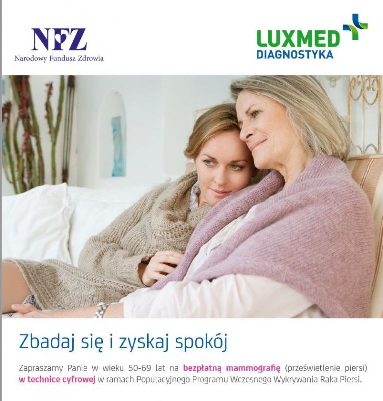 LUX MED po raz kolejny zaprasza Panie w wieku 50-69 lat na bezpłatne badania mammograficzne w ramach Programu Profilaktyki Raka Piersi finansowanego przez NFZ. W badaniu mogą wziąć udział Panie w wieku 50-69 lat, które są ubezpieczone, nie są leczone z powodu raka piersi a także: • nie miały wykonanej mammografii w ramach Programu w ciągu ostatnich 24 miesięcy • lub są w grupie ryzyka i w roku poprzedzającym otrzymały pisemne wskazanie do wykonania ponownej mammografii po upływie 12 miesięcy.
