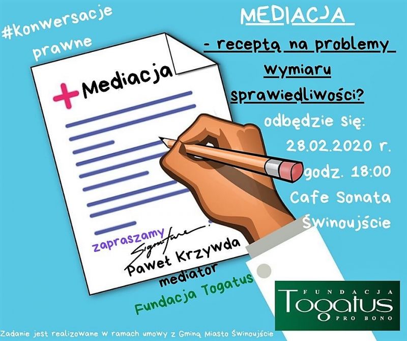 Otwarte konwersacje prawne pt. „Mediacje – receptą na problemy wymiaru sprawiedliwości” odbędą się 28 lutego 2020 r. w godzinach 18.00 - 21.00 w Cafe Sonata w Świnoujściu. Udział w konwersacjach jest bezpłatny. Prowadzącym będzie aplikant Paweł Krzywda. Organizatorem jest Fundacja Togatus Pro Bono z siedzibą w Olsztynie.