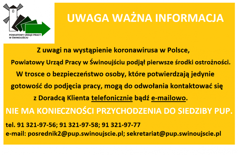 Z uwagi na wystąpienie koronawirusa w Polsce, Powiatowy Urząd Pracy w Świnoujściu podjął pierwsze środki ostrożności. W trosce o bezpieczeństwo - osoby, które potwierdzają jedynie gotowość do podjęcia pracy, mogą do odwołania kontaktować się z Doradcą Klienta telefonicznie bądź e-mailowo. Nie ma konieczności przychodzenia do siedziby PUP. Czytaj więcej.
