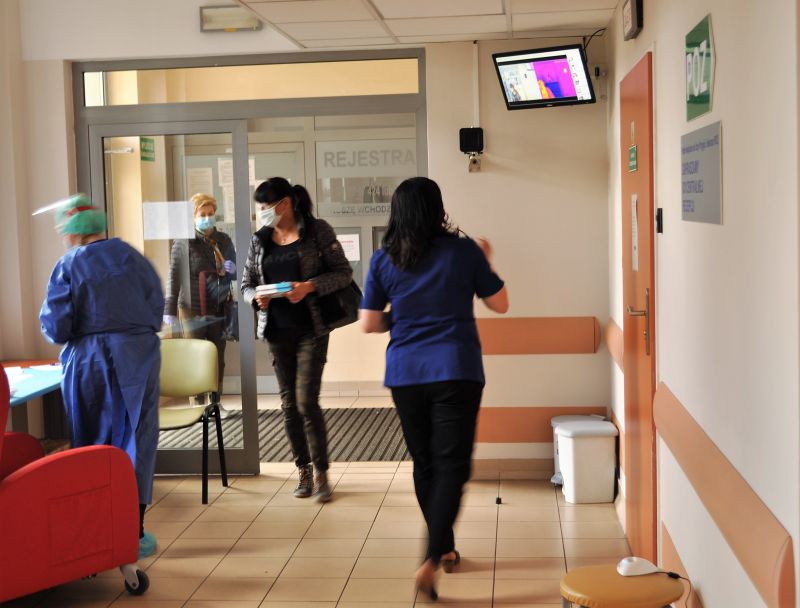 Szpital miejski. Termowizyjna kamera mierzy temperaturę wchodzącym.