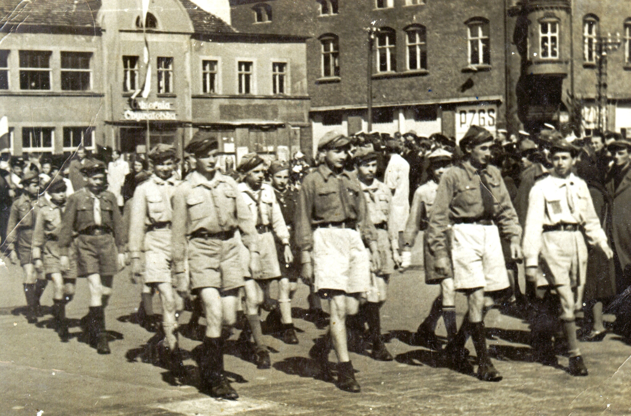Foto: I Męska Drużyna Harcerska w 1947 podczas pochodu I majowego w Świnoujściu z niej