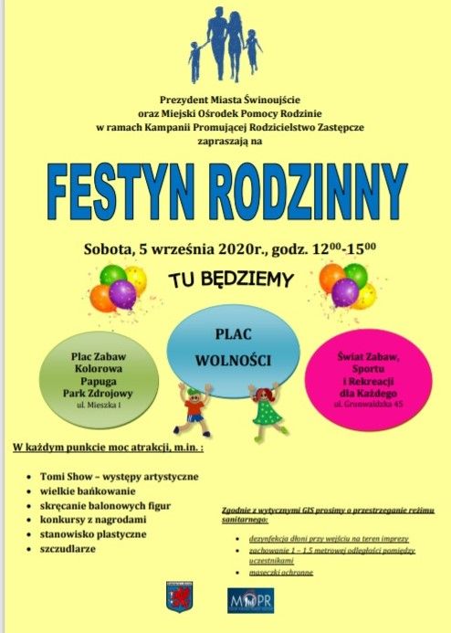 W tym roku zaplanowane zostały animacje i występy artystyczne dla dzieci - „Festyn Rodzinny”, który odbędzie się 5 września 2020r. w godzinach od 12 00 do 1500. Ze względu na zagrożenie epidemiologiczne oraz potrzebę rozproszenia skupiska zainteresowanych osób impreza została zaplanowana w trzech lokalizacjach w mieście tj. Plac Wolności, Plac Zabaw przy ul. Mieszka I oraz Plac Zabaw przy ul. Grunwaldzkiej 45.