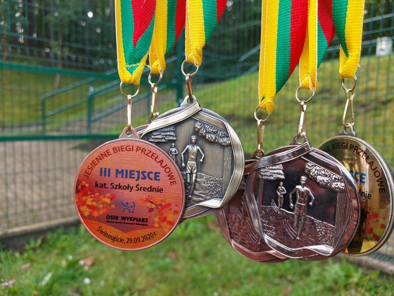 Na zdjęciu medale dla najlepszych zawodników Jesiennych Biegów Przełajowych.
