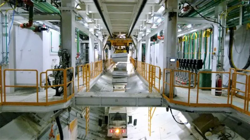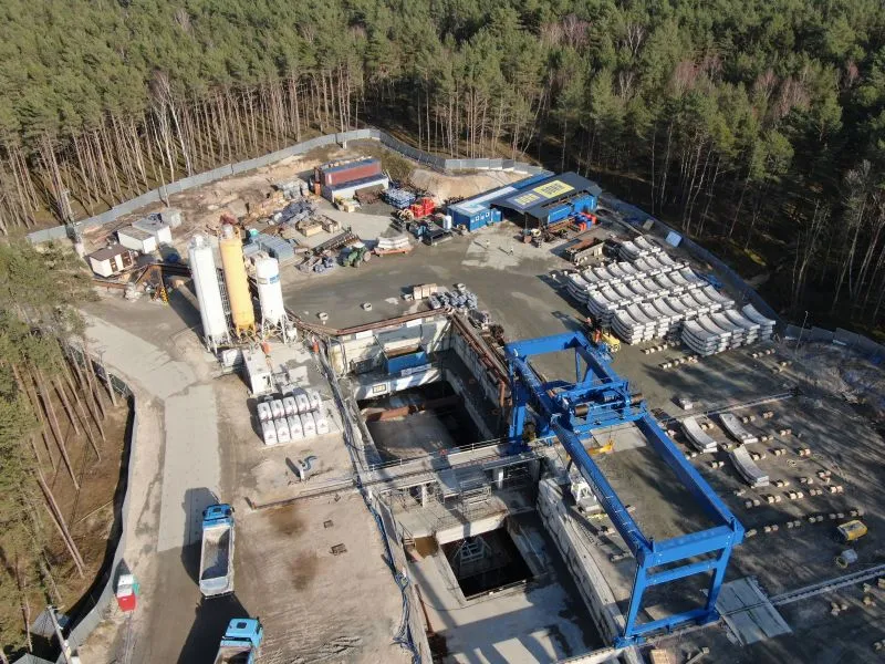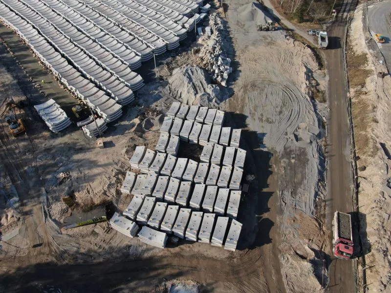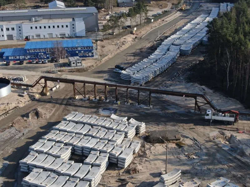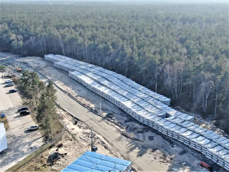 Gotowe elementy pierścieni (tzw. tubingi) są składowane na placu magazynowym, skąd w odpowiedniej kolejności przewożone są do komory startowej.
