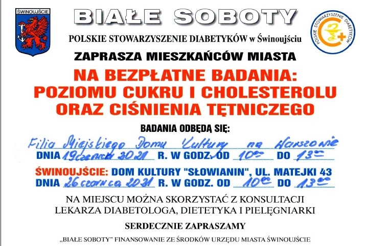 Polskie Stowarzyszenie Diabetyków w Świnoujściu zaprasza mieszkańców Świnoujścia na bezpłatne badania poziomu cukru, cholesterolu oraz ciśnienia tętniczego.