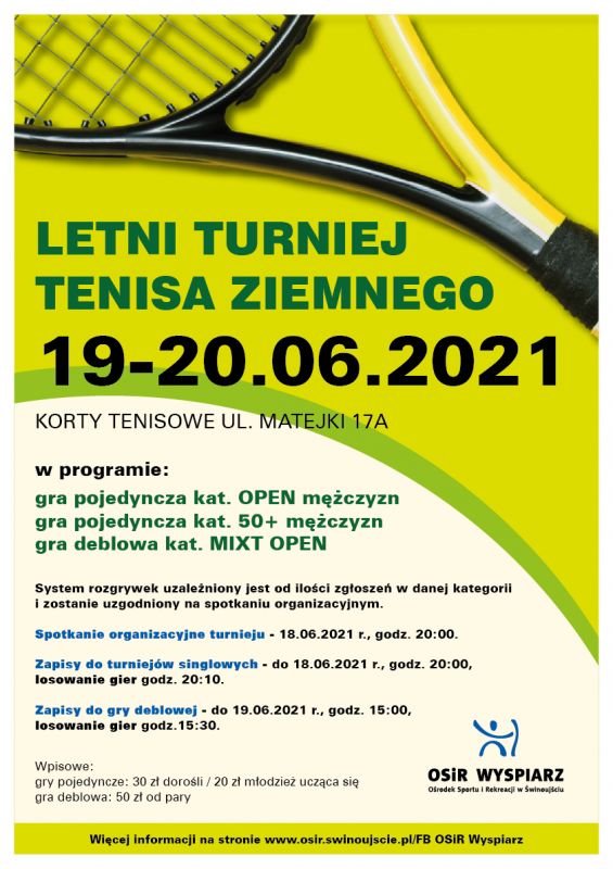 Ośrodek Sportu i Rekreacji „Wyspiarz” zaprasza na Letni Turniej Tenisa Ziemnego w dniach 19-20 czerwca 2021 r. Zobacz szczegóły.