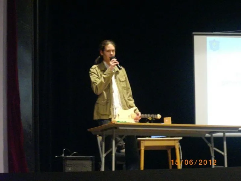 Paweł Cembala, uczeń klasy II świnoujskiego liceum ,zaprezentował doswiadczenie "Laserowa gitara". Doświadczenie polegało na generowaniu dźwięku przy pomocy strumienia światła laserowego. Paweł zbudował gitarę, na której grał i tworzył dźwięki wykorzystując ... promień światła. Uczniowie naszego liceum trzeci raz z rzędu wygrywają nagrody w tym konkursie.