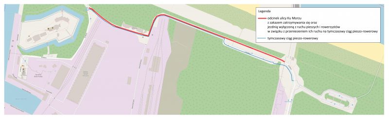 Tymczasowa organizacja ruchu na ul. Ku Morzu dotyczy odcinka między wschodnimi falochronami – tj. między rondem przy kąpielisku morskim Świnoujście Warszów a przystankiem autobusowym przy Forcie Gerharda i Latarni Morskiej. Na tym odcinku ulicy Ku Morzu zostanie wprowadzony zakaz ruchu pieszych i rowerzystów na jezdni, natomiast wzdłuż niej Wykonawca zapewni wydzielony tymczasowy ciąg pieszo-rowerowy, którym będą mogli się poruszać piesi i rowerzyści.