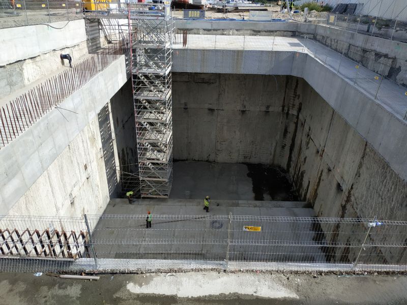 Aktualnie w komorze startowej trwa wiercenie otworów, które umożliwią wklejanie prętów pod wsporniki stropu pośredniego. Aby zamontować wsporniki, wykonywane są także bruzdy w ścianach szczelinowych.