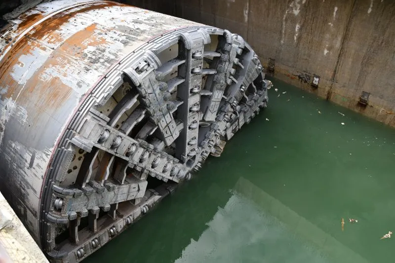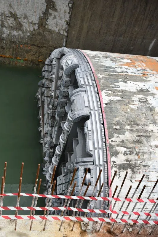 Zanim Wyspiarka weszła do szybu odbiorczego zatrzymała się tuż przed betonową ścianą szczelinową. Komora robocza maszyny przeszła jeszcze inspekcję. A w maszynie sprawdzono stan narzędzi tnących oraz urabiających. Przewiercenie się przez ścianę szczelinową było nie lada wyzwaniem – to blok o grubości 16 metrów.