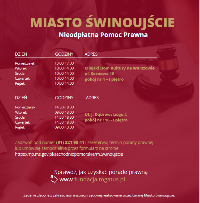 Fundacja Togatus Pro Bono, w ramach realizacji rządowego programu prowadzi punkt nieodpłatnej pomocy prawnej na terenie Miasta Świnoujście.