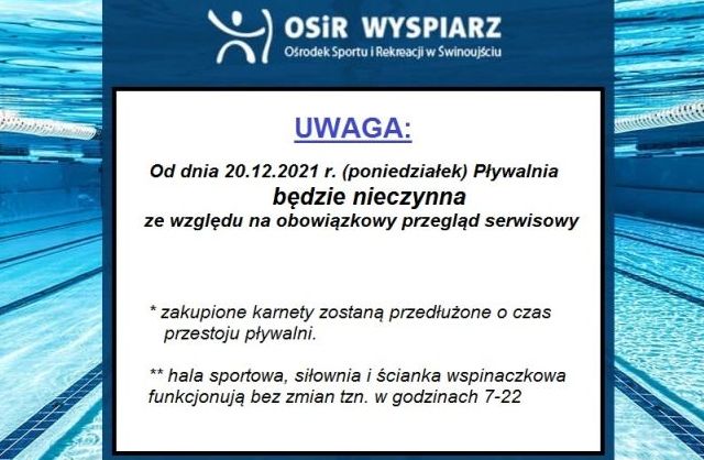 Od 20 grudnia 2021 r. Pływalnia Miejska przy ul. Grodzkiej 5 w obiekcie Uznam Arena, będzie nieczynna do odwołania. Wykonywane będą obowiązkowe przeglądy serwisowe. Poinformujemy Państwa o terminie zakończenia prac technicznych. Pozostałe obiekty sportowe w Uznam Arenie dostępne są bez zmian. Zapraszamy do korzystania z hali sportowej, ścianki wspinaczkowej i siłowni codziennie w godzinach 7-22.