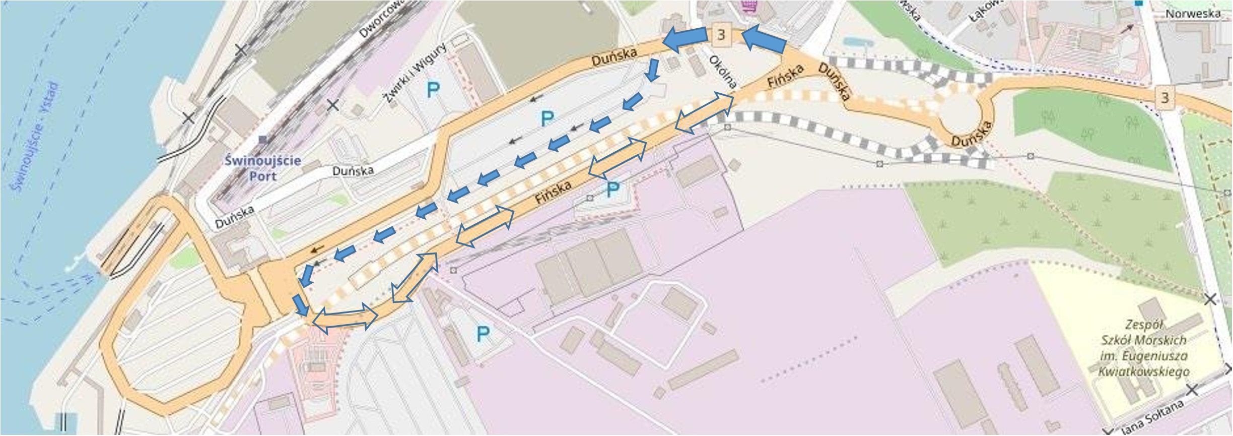 Ulica Duńska będzie tymczasowo jednokierunkowa od skrzyżowania z ulicą Fińską do terenu terminala promowego. Objazd w przeciwnym kierunku, tzn. z terenu terminala promowego do ulicy Duńskiej (DK3), poprowadzony będzie przez parking terminala promowego wyznaczonym jednokierunkowym korytarzem do ulicy Fińskiej.