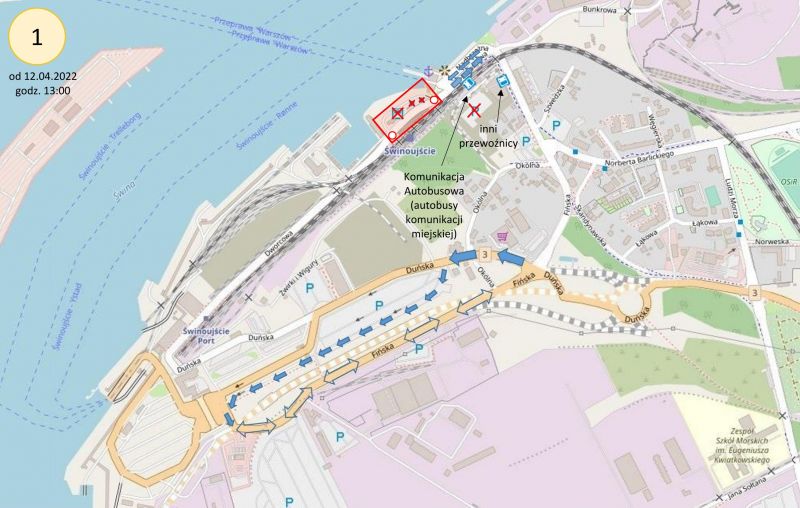 Na ulicy Nadbrzeżnej pas ruchu przeznaczony dotychczas dla pojazdów z pierwszeństwem wjazdu na prom dostępny będzie tymczasowo do przejazdu na ulicę Dworcową (tzn. zawrócenia w stronę ulicy Barlickiego) dla wszystkich pojazdów.