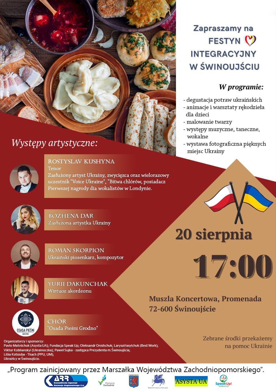 Będzie degustacja ukraińskich potraw, występy muzyczne, animacje i warsztaty rękodzieła dla dzieci oraz wystawa zdjęć najpiękniejszych miejsc w Ukrainie. Festyn odbędzie się w sobotę 20 sierpnia 2022r. w muszli koncertowej przy promenadzie. Początek o godzinie 17.00.